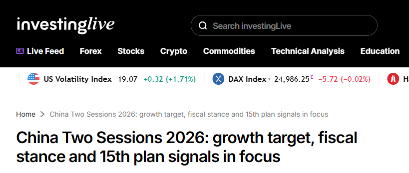 美國知名財經(jīng)網(wǎng)站Investinglive重點新一年度政府工作報告,該報告通常會設(shè)定年度主要目標(biāo)和政策任務(wù),并最清晰地傳遞出中央政府的宏觀政策取向。