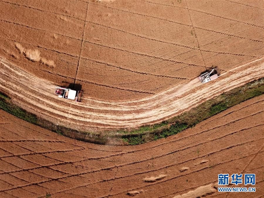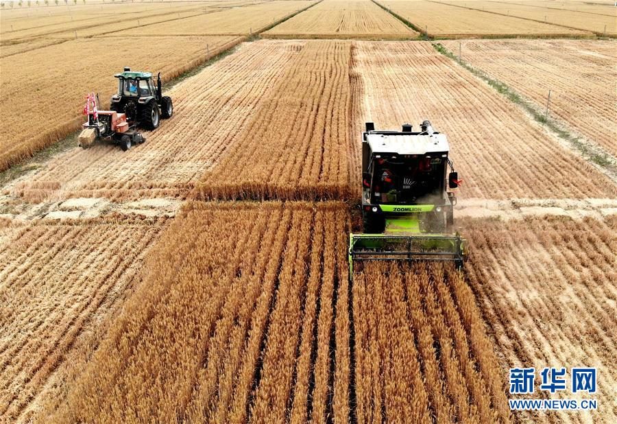5月29日,在河南省商水縣南陵村的一處麥田里,農(nóng)機(jī)手操作收割機(jī)和小麥秸稈打捆機(jī)(無人機(jī)照片)。眼下,“中原糧倉”河南迎來豐收季,各地農(nóng)民搶抓農(nóng)時(shí)收割小麥。截至5月29日17時(shí),全省已收獲小麥3315萬畝,日投入聯(lián)合收割機(jī)7.8萬臺(tái)。新華社記者李安攝