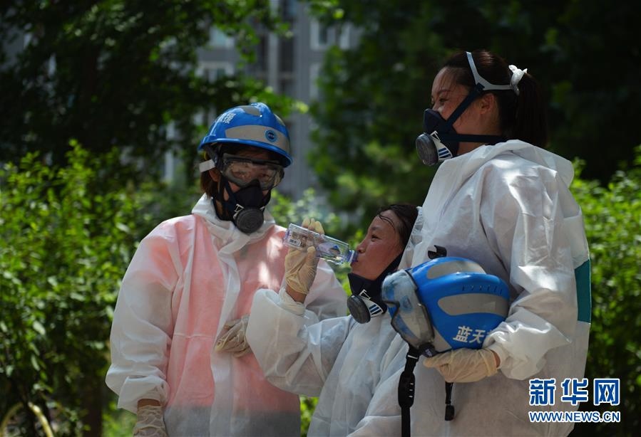 6月16日,北京藍(lán)天救援隊隊員在完成對豐臺區(qū)一居民區(qū)消殺作業(yè)后休息。連日來,北京出現(xiàn)高溫天氣??崾钪?,工作人員堅守抗擊疫情一線,成為烈日下的“逆行者”。新華社發(fā)(陳鐘昊攝)