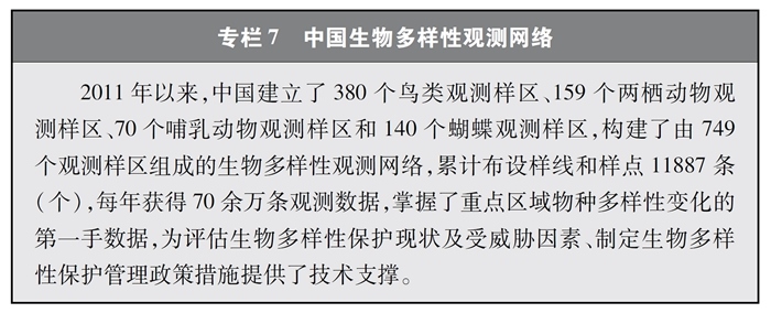 完善監(jiān)測觀測網(wǎng)絡(luò)。中國建立起各類生態(tài)系統(tǒng)、物種的監(jiān)測觀測網(wǎng)絡(luò),在生物多樣性理論研究、技術(shù)示范與推廣以及物種與生境保護(hù)方面發(fā)揮了重要作用,為科研、教育、科普、生產(chǎn)等各領(lǐng)域提供了多樣化的信息服務(wù)與決策支持。其中,中國生態(tài)系統(tǒng)研究網(wǎng)絡(luò)(CERN)、國家陸地生態(tài)系統(tǒng)定位觀測研究網(wǎng)絡(luò)(CTERN)涵蓋所有生態(tài)系統(tǒng)和要素,中國生物多樣性監(jiān)測與研究網(wǎng)絡(luò)(Sino BON)覆蓋動(dòng)物、植物、微生物等多種生物類群,中國生物多樣性觀測網(wǎng)絡(luò)(China BON)構(gòu)建了覆蓋全國的指示物種類群觀測樣區(qū)。