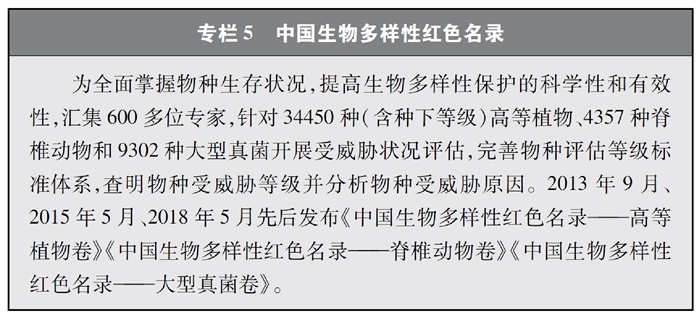 開展全國生物多樣性調(diào)查與評估。大力推進(jìn)生物多樣性保護(hù)重大工程實(shí)施,結(jié)合自然資源調(diào)查、生態(tài)系統(tǒng)監(jiān)測評估等工作,不斷完善生物多樣性調(diào)查與評估能力,首次將生物多樣性指標(biāo)納入生態(tài)質(zhì)量綜合評價(jià)指標(biāo)體系,引導(dǎo)地方加強(qiáng)生態(tài)文明建設(shè)與生物多樣性保護(hù)。開展自然資源調(diào)查,包括森林、草原、水、濕地、荒漠、海洋等,建立自然資源調(diào)查評價(jià)監(jiān)測制度。構(gòu)建了涵蓋2376個(gè)縣級行政單元、樣線總長超過3.4萬公里的物種分布數(shù)據(jù)庫,建立物種資源調(diào)查及收集信息平臺(tái),準(zhǔn)確反映野生動(dòng)植物空間分布狀況。完成長江經(jīng)濟(jì)帶、京津冀等國家戰(zhàn)略區(qū)域180多個(gè)縣級行政區(qū)生物多樣性調(diào)查與評估。組織開展近海漁業(yè)資源調(diào)查,初步掌握近海漁業(yè)資源狀況。陸續(xù)發(fā)布《中國植物紅皮書》《中國瀕危動(dòng)物紅皮書》《中國物種紅色名錄》《中國生物多樣性紅色名錄》,基本掌握生物多樣性總體情況,為加強(qiáng)生物多樣性保護(hù)奠定了科學(xué)基礎(chǔ)。