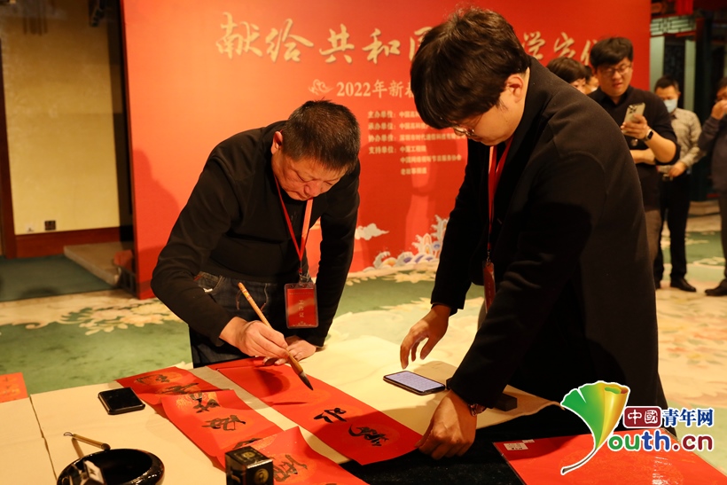 圖為書(shū)法家書(shū)寫(xiě)"福"字和春聯(lián)。中國(guó)青年網(wǎng)記者 左橙 攝