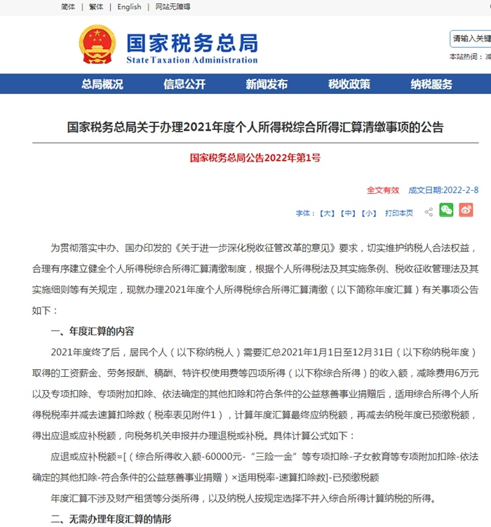 為貫徹落實(shí)中辦、國辦印發(fā)的《關(guān)于進(jìn)一步深化稅收征管改革的意見》要求,切實(shí)維護(hù)納稅人合法權(quán)益,合理有序建立健全個人所得稅綜合所得匯算清繳制度,根據(jù)個人所得稅法及其實(shí)施條例、稅收征收管理法及其實(shí)施細(xì)則等有關(guān)規(guī)定,現(xiàn)就辦理2021年度個人所得稅綜合所得匯算清繳(以下簡稱年度匯算)有關(guān)事項(xiàng)公告如下: