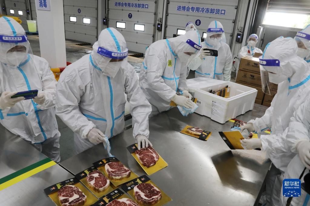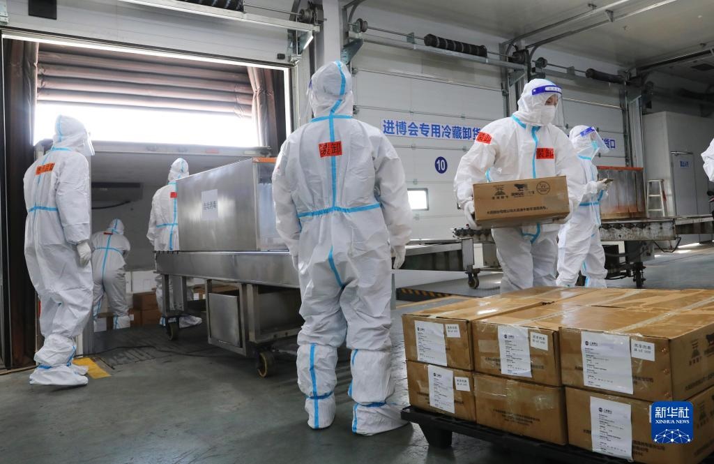 10月20日,工作人員在總倉內(nèi)搬運完成卸車消毒的冷鏈食品展品。新華社記者 方喆攝