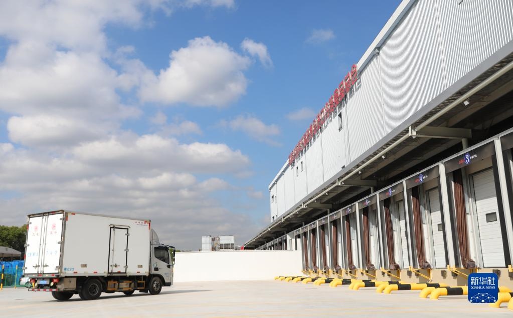 10月20日,裝載第一批進口冷鏈食品展品的卡車駛?cè)肟倐}卸貨區(qū)域。新華社記者 方喆攝