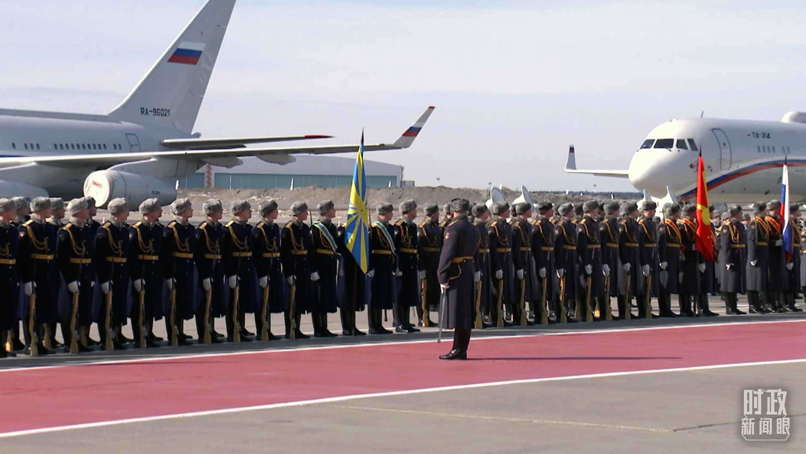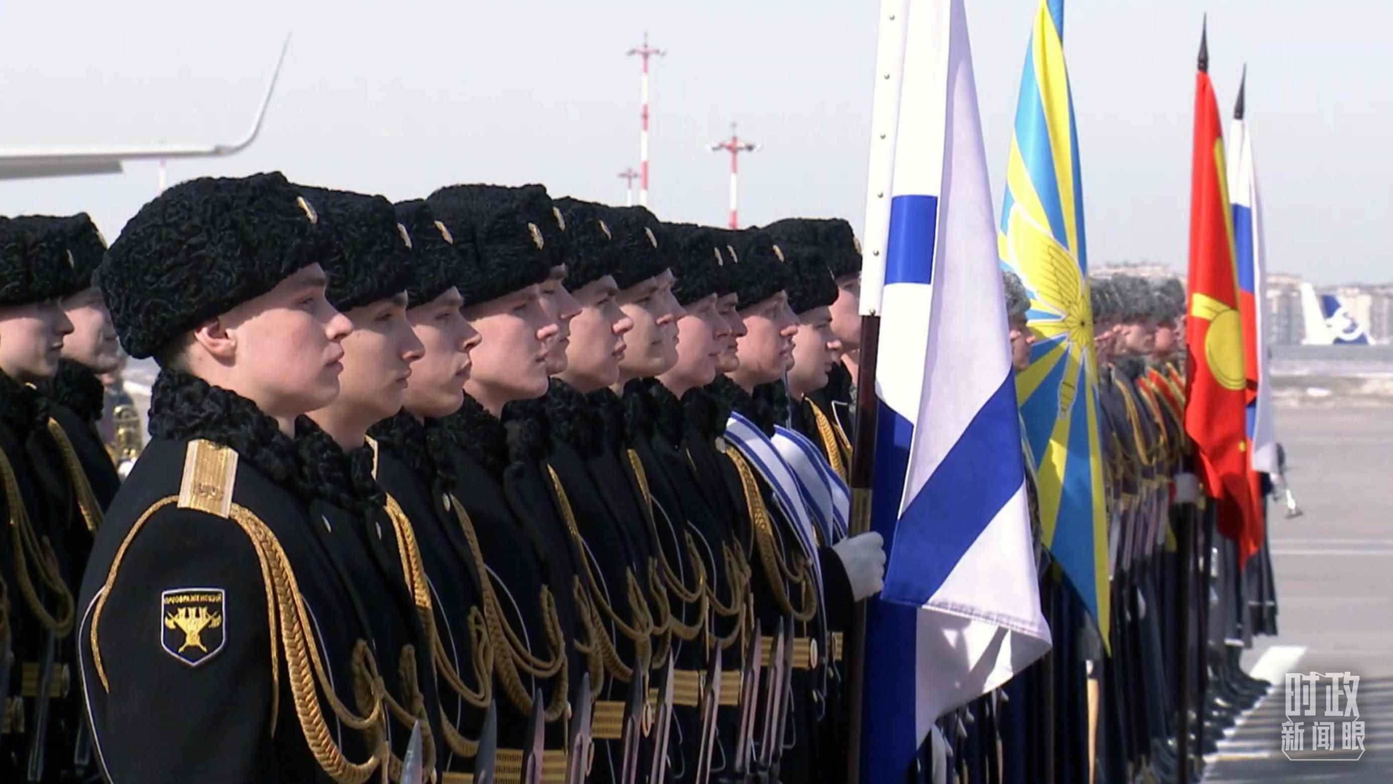俄方在機(jī)場(chǎng)舉行隆重迎賓儀式。軍樂(lè)團(tuán)奏中俄兩國(guó)國(guó)歌。習(xí)主席檢閱俄羅斯三軍儀仗隊(duì)并觀看分列式。