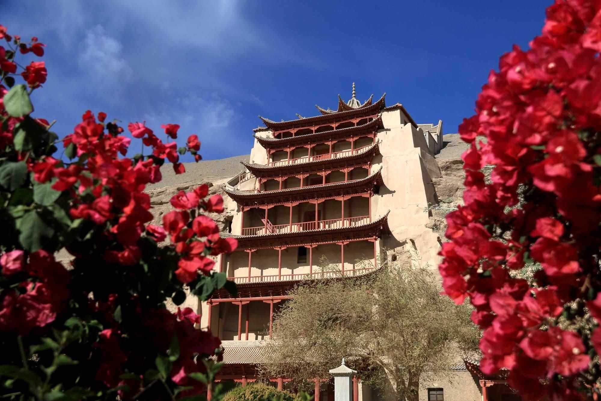 2023年4月27日,甘肅酒泉,敦煌市莫高窟景區(qū)的桃花、三角梅競(jìng)相綻放,游人賞景賞花,樂(lè)在其中。視覺(jué)中國(guó)