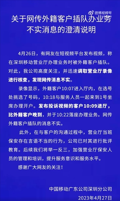 ·深圳移動否認(rèn)“外籍客戶插隊”:調(diào)錄像核查,發(fā)布投訴視頻的客戶晚到。