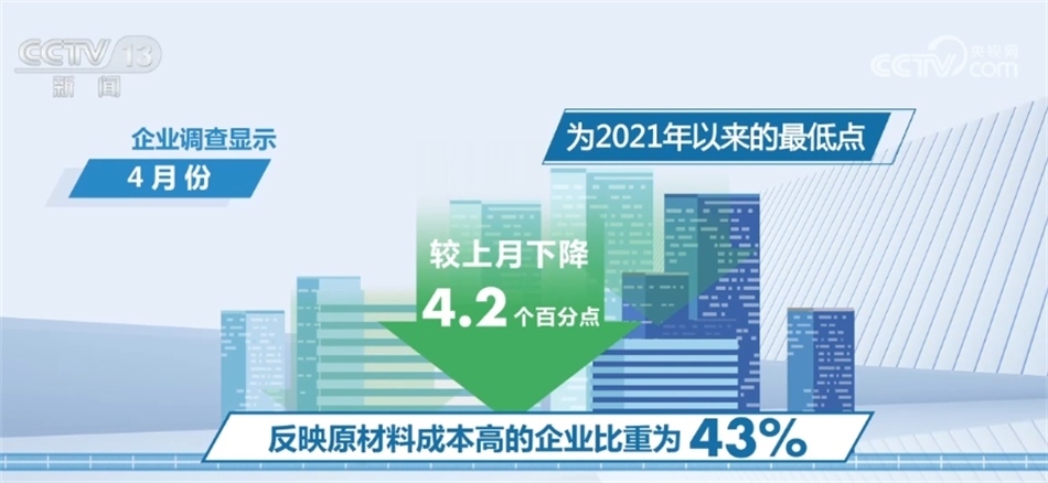 今年以來,原材料成本、物流和勞動(dòng)力成本普遍回落。企業(yè)調(diào)查顯示,4月份反映原材料成本高的企業(yè)比重為43%,較上月下降4.2個(gè)百分點(diǎn),為2021年以來的最低點(diǎn)。反映物流成本高和勞動(dòng)力成本高的企業(yè)比重分別為27.5%和30%,較上月下降1.9和1.1個(gè)百分點(diǎn)。
