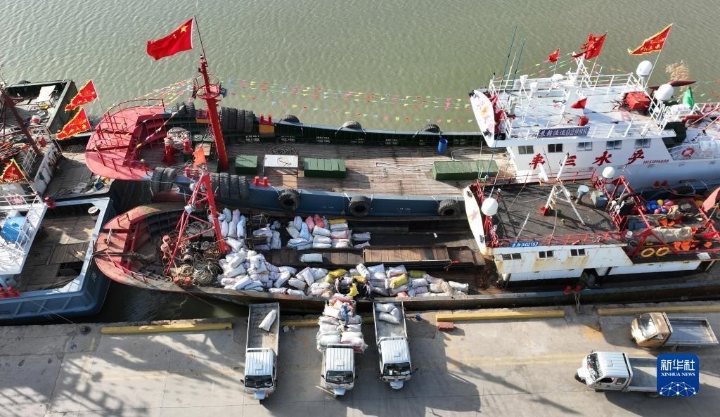 4月30日,在江蘇省連云港市贛榆區(qū)青口漁港碼頭,漁民在卸載漁具,為即將到來(lái)的伏季休漁做準(zhǔn)備(無(wú)人機(jī)照片)。