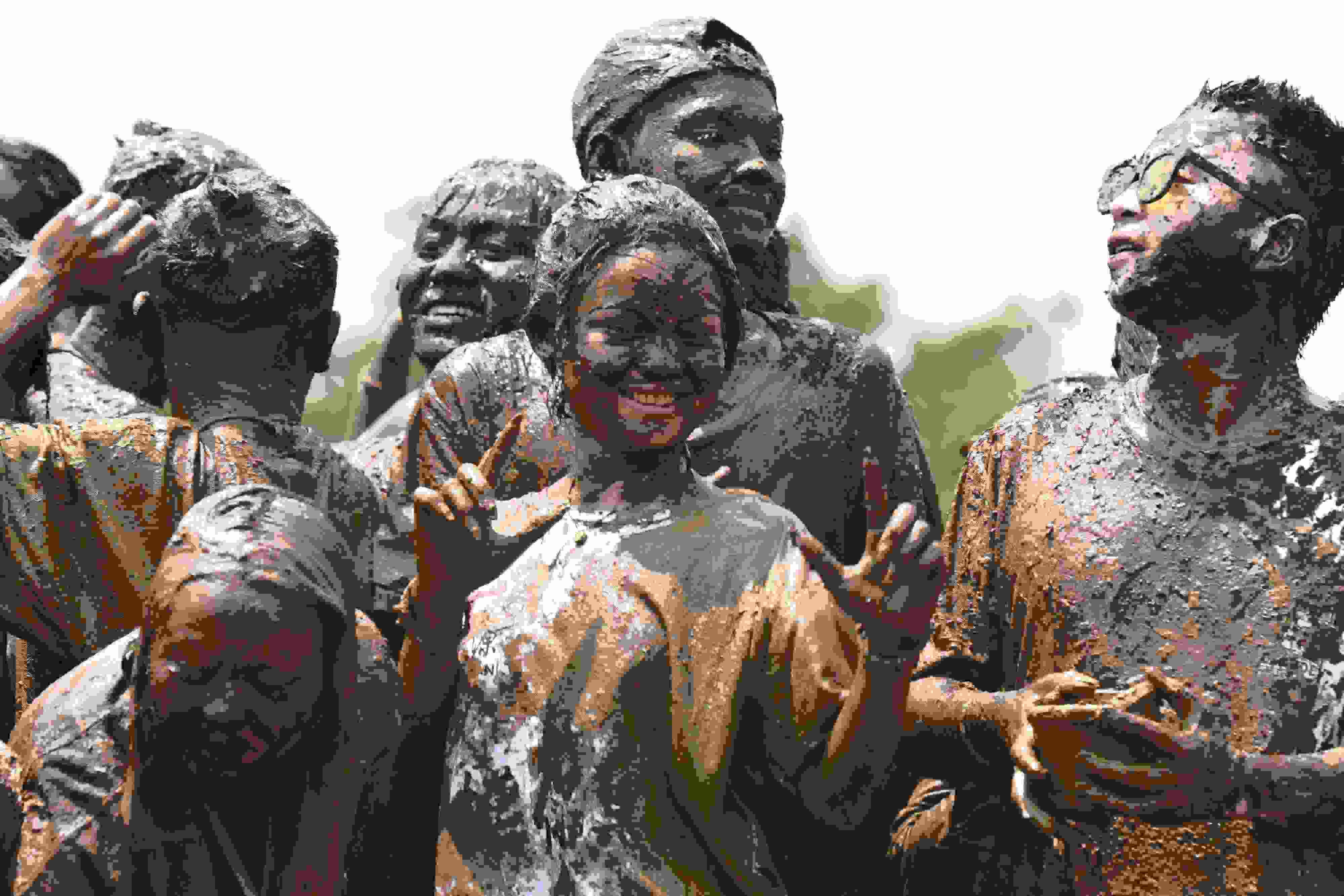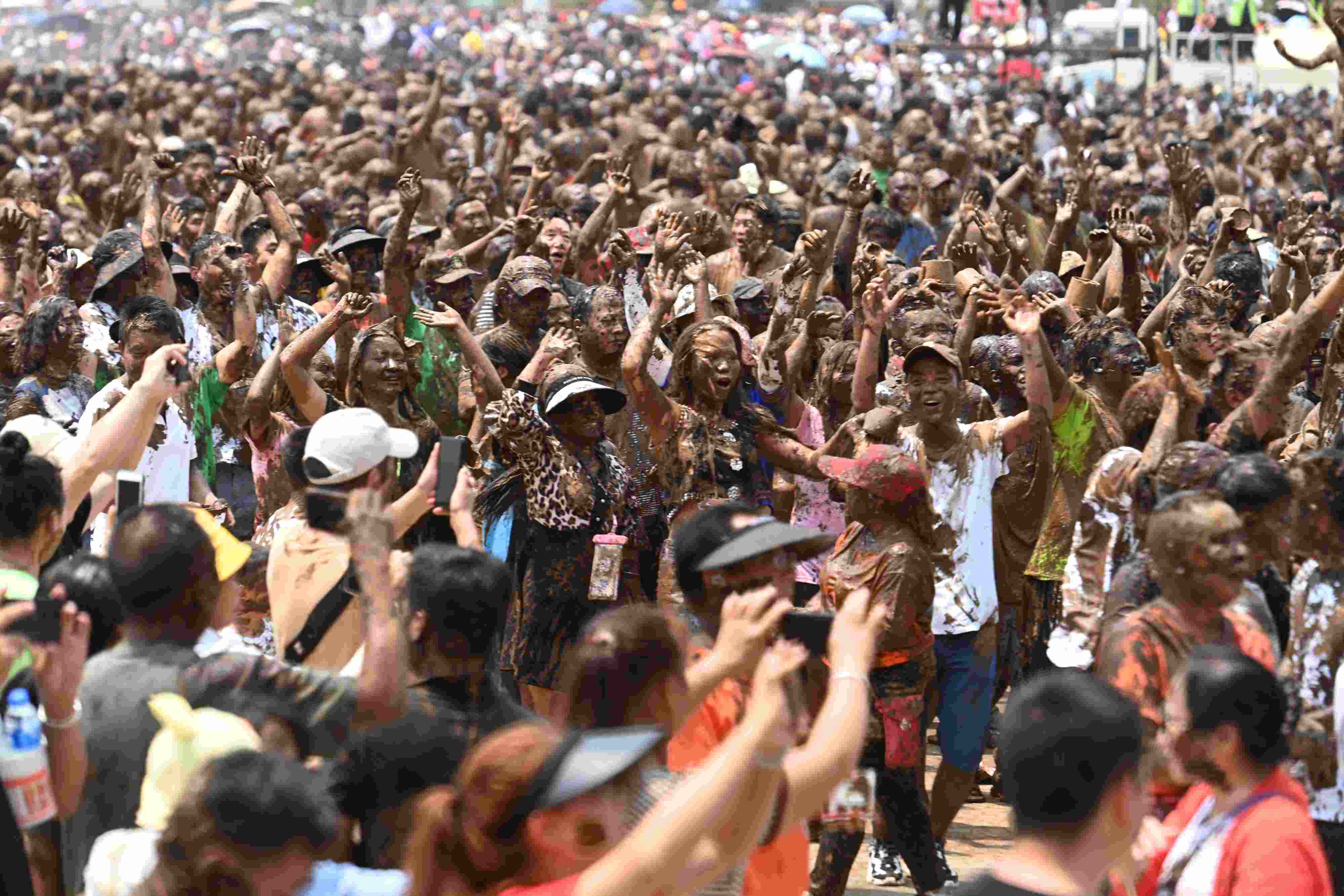 2023年4月30日,云南臨滄,游客相互抹泥表示祝福。當日,2023年中國佤族司崗里摸你黑狂歡節(jié)在云南省臨滄市滄源佤族自治縣啟幕。人們用天然原料“娘布洛”配置而成的涂料相互涂抹表示祝福,摸得越黑,代表快樂幸福越長久。 視覺中國