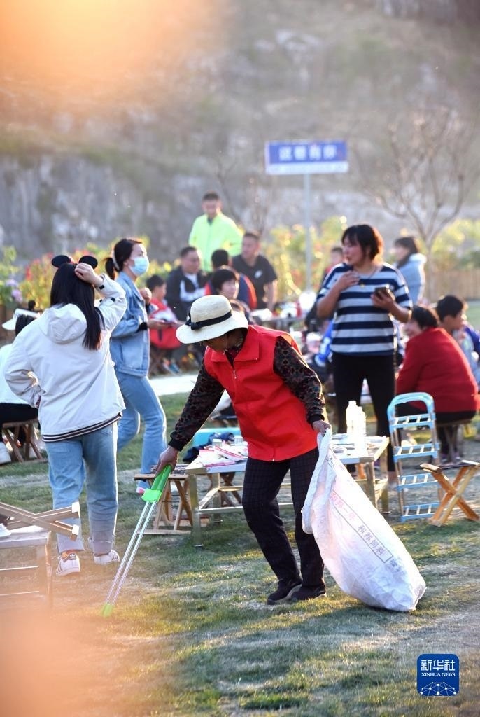 4月30日,在淄博市沂源縣悅莊鎮(zhèn)下龍巷村燒烤廣場(chǎng),一名志愿者在撿拾垃圾。   新華社發(fā)(趙東山攝)