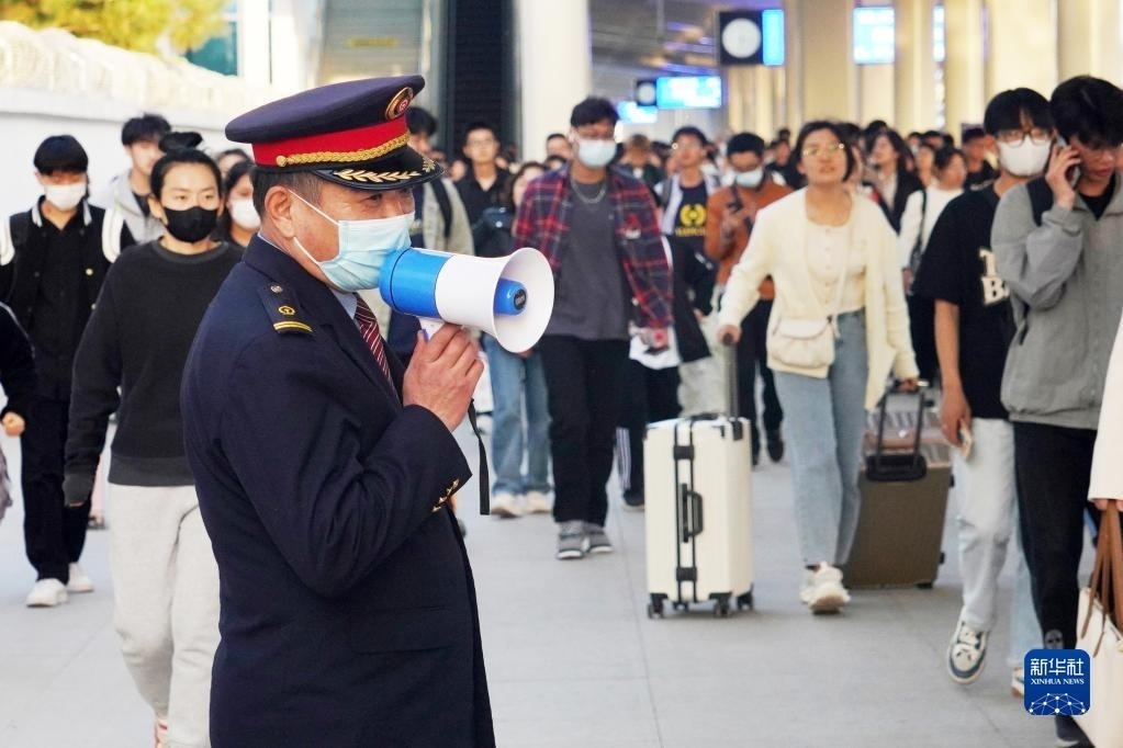 4月29日,淄博火車站工作人員在引導(dǎo)出站旅客。   新華社發(fā)(劉炳友攝)