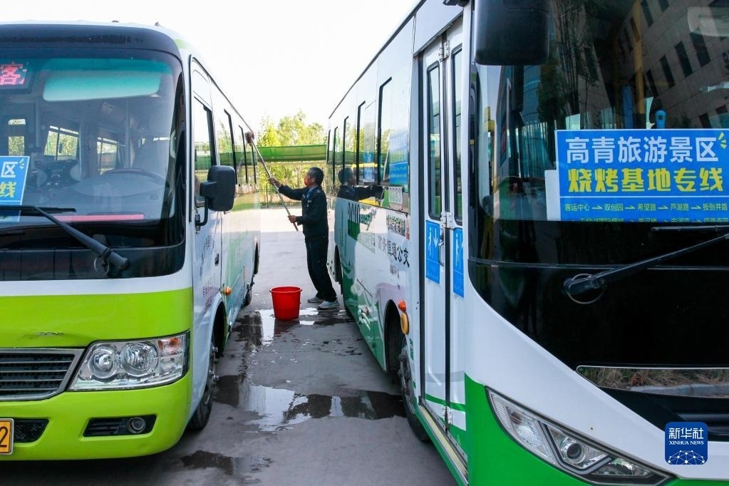 4月29日,在淄博市高青縣客運(yùn)站,一名司機(jī)在保養(yǎng)車輛。當(dāng)?shù)赝瞥?元“燒烤公交”專線方便游客出行。   新華社發(fā)(張維堂攝)