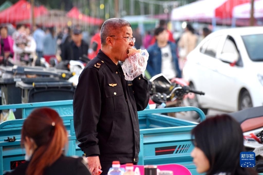 4月30日,在淄博市沂源縣悅莊鎮(zhèn)下龍巷村燒烤廣場(chǎng),鎮(zhèn)市場(chǎng)監(jiān)督管理所的一名工作人員在值勤現(xiàn)場(chǎng)吃晚餐。   新華社發(fā)(趙東山攝)