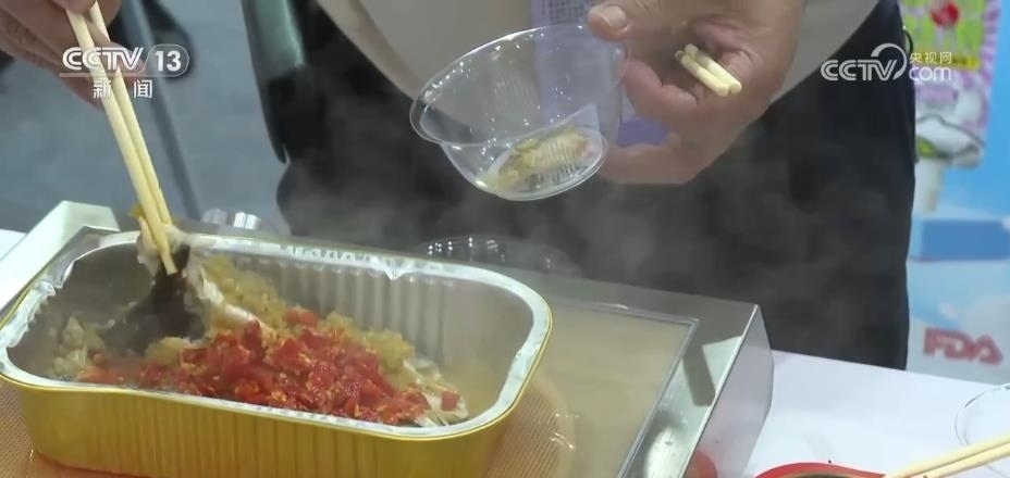 最受歡迎的莫過于預(yù)制菜的展位,熱辣的川菜、清淡的粵菜、精致的中式點(diǎn)心,還有各地的特色小吃,各種菜品應(yīng)有盡有。一加熱,香氣四溢,引來不少外國客商試吃。