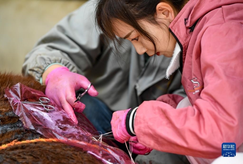 白婳在固原市原州區(qū)開城鎮(zhèn)雙泉村為村民李百武的一頭??p合傷口(4月18日攝)。
