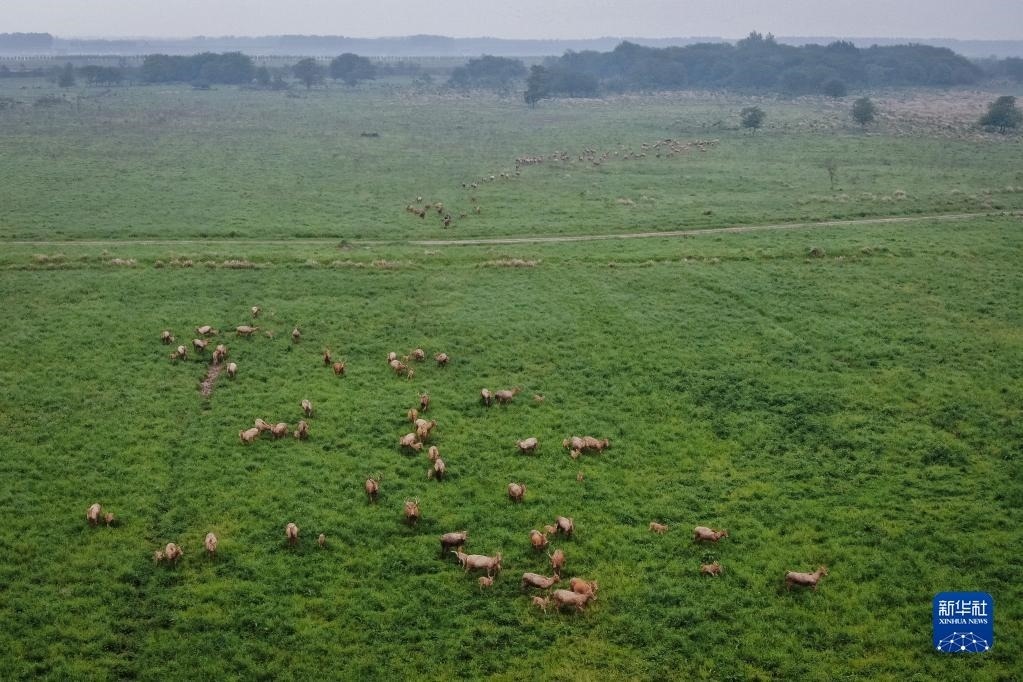 4月28日,一群麋鹿在石首麋鹿國家級自然保護(hù)區(qū)活動(無人機照片)。 新華社記者 伍志尊 攝
