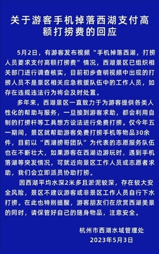 ·西湖景區(qū)回應(yīng)高價撈手機:非工作人員,接到求助會免費打撈。