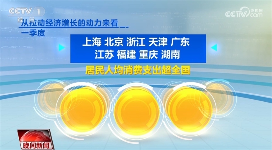 此外,各地經(jīng)濟(jì)發(fā)展也呈現(xiàn)回升向好態(tài)勢。目前,全國31個省(區(qū)、市),已經(jīng)全部公布一季度的經(jīng)濟(jì)運行數(shù)據(jù)。從GDP增速來看,31個省(區(qū)、市)中有23個省份跑贏全國一季度GDP平均增速4.5%,從地區(qū)GDP總量看,有12個省份超1萬億,廣東超過了3萬億。從拉動經(jīng)濟(jì)增長的動力來看,一季度,上海、北京、浙江、天津、廣東、江蘇、福建、重慶、湖南9省份,居民人均消費支出超全國。
