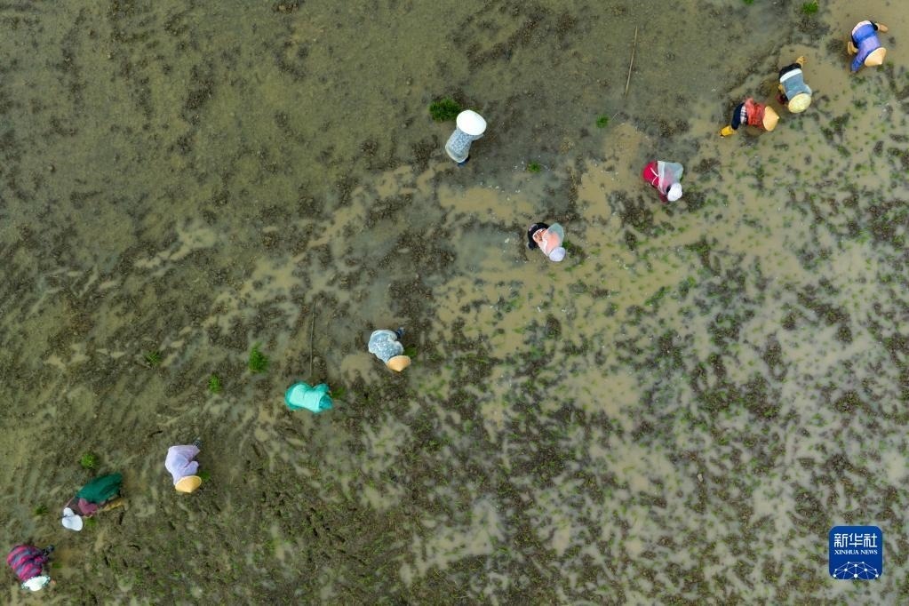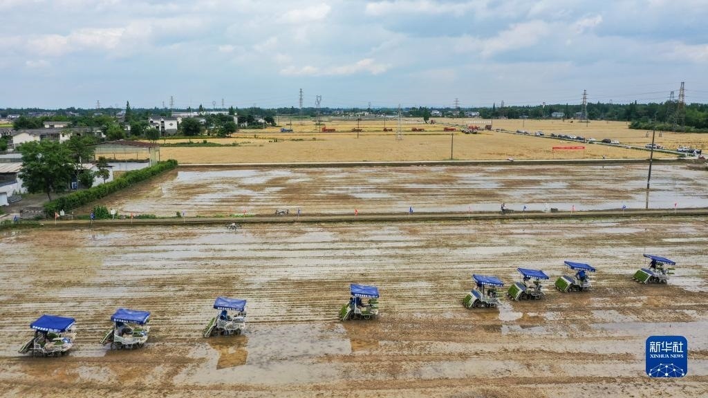 5月9日,在四川省崇州市道明鎮(zhèn)協(xié)和社區(qū),農(nóng)民在一片高標(biāo)準(zhǔn)農(nóng)田里種植水稻。