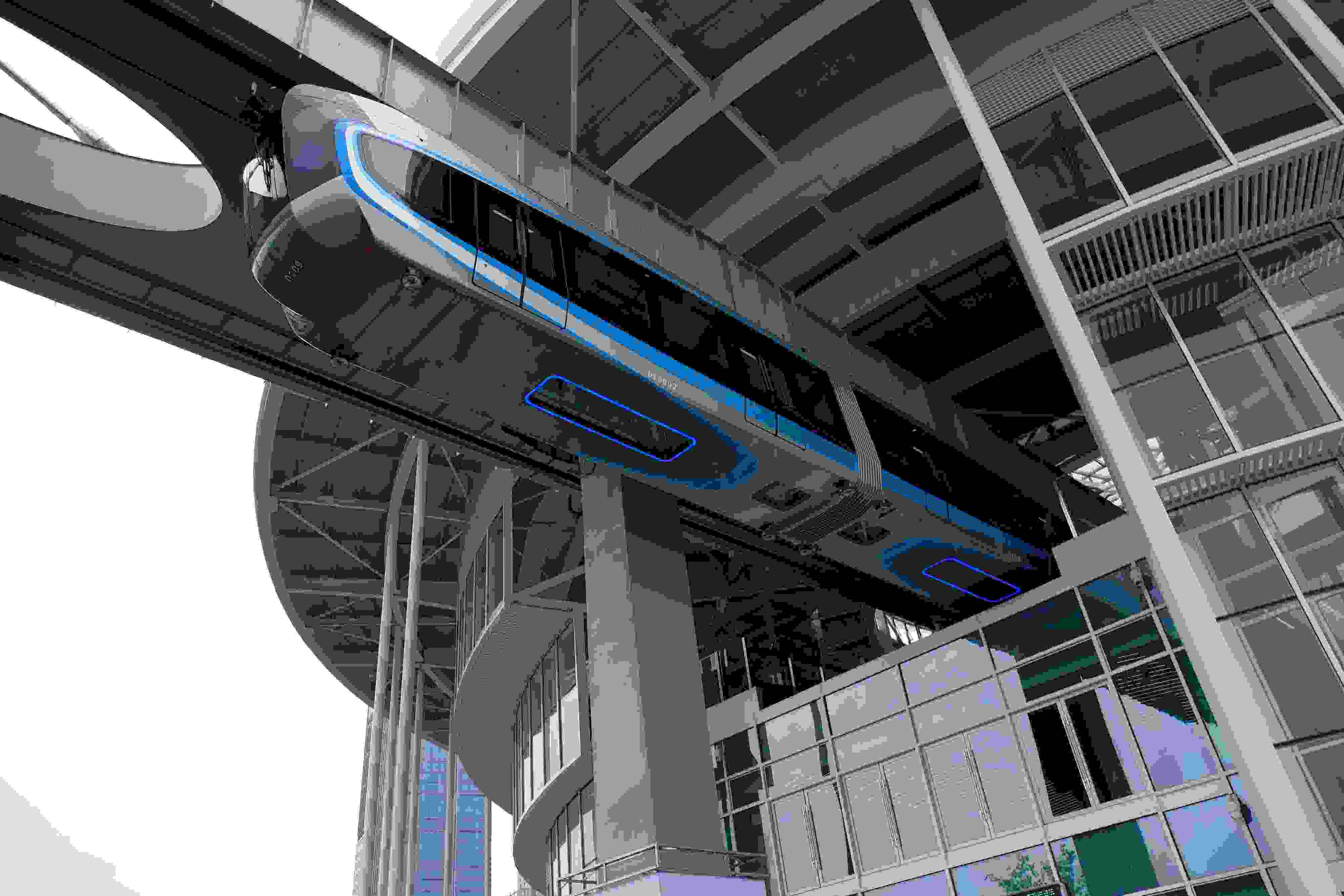 2023年5月11日,武漢,光谷空軌旅游線項(xiàng)目“光谷光子號(hào)”空中軌道列車(chē)在東湖高新區(qū)試跑。武漢光谷空軌旅游線項(xiàng)目位于武漢市東湖高新區(qū)光谷中央生態(tài)大走廊內(nèi),是生態(tài)大走廊旅游配套基礎(chǔ)設(shè)施之一。其規(guī)劃總長(zhǎng)26.7公里,先行建設(shè)的一期工程長(zhǎng)約10.5公里,設(shè)車(chē)站6座。 視覺(jué)中國(guó)