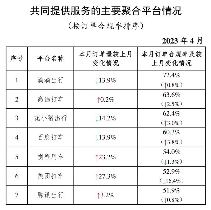 其中,面向乘客、與網(wǎng)約車平臺(tái)公司共同提供服務(wù)的平臺(tái)(俗稱“聚合平臺(tái)”)完成1.96億單,環(huán)比下降0.7%。按訂單合規(guī)率由高到低的分別是滴滴出行、高德打車、花小豬出行、百度打車、攜程用車、美團(tuán)打車、騰訊出行。