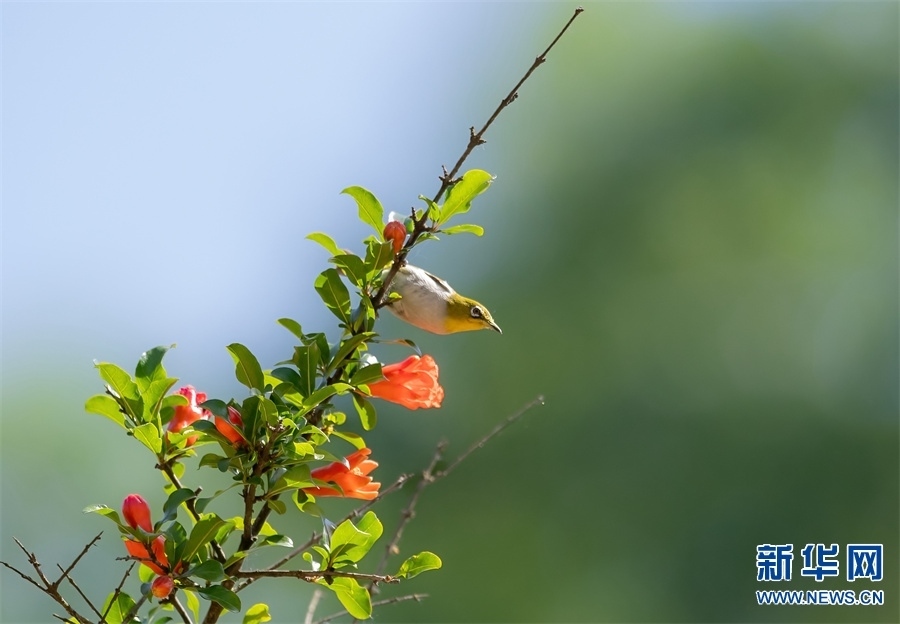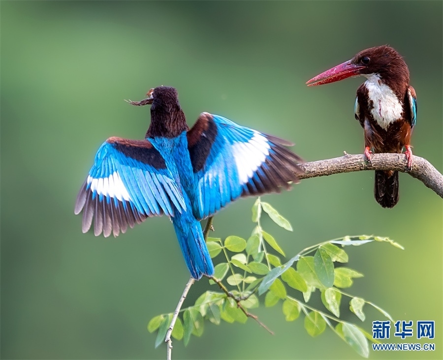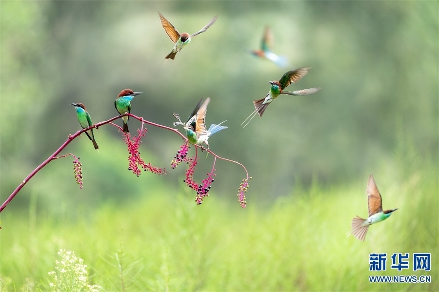 河南省信陽市新縣位于南北氣候過渡帶,地跨長江、淮河兩大流域,植被覆蓋率達95%,森林覆蓋率達76.7%。得天獨厚的自然生態(tài)環(huán)境,吸引了藍喉蜂虎、藍翡翠、戴勝等眾多鳥類在這里“安營扎寨”,繪出一幅生動和諧的自然畫卷。新華網(wǎng)發(fā)(闞敦傳 攝)
