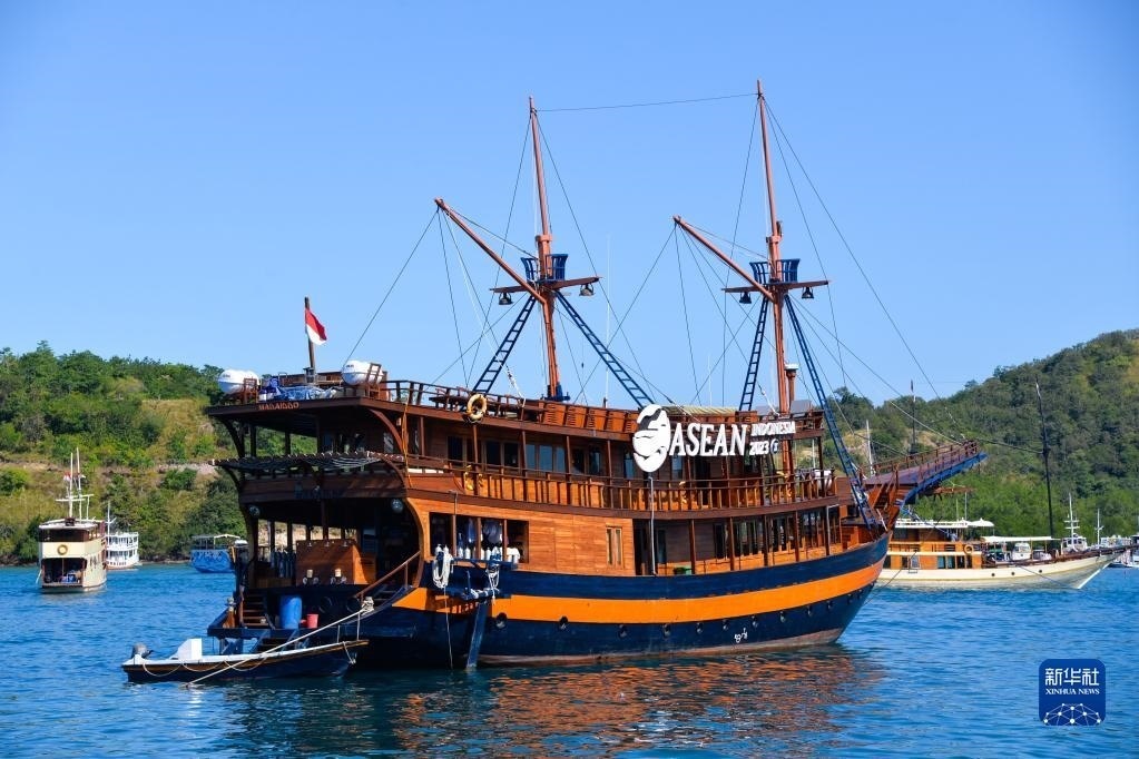 這是5月12日在印度尼西亞拉布安巴焦海邊拍攝的一艘掛著2023年東盟峰會標(biāo)志的游船。
