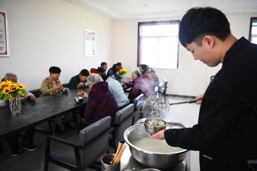 樊金林(右)在許昌福瑞園養(yǎng)老院為老人盛餃子(4月25日攝)。新華社記者 張浩然 攝