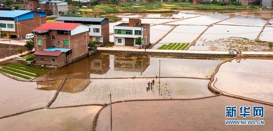 初夏時節(jié),廟宇鎮(zhèn)農(nóng)戶在農(nóng)田里插秧忙。新華網(wǎng)發(fā)(朱云平 攝)