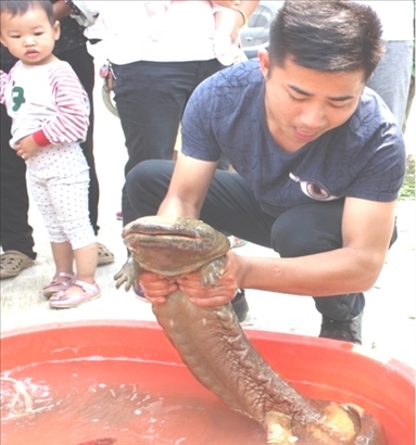 戴莊村民將野生娃娃魚(yú)送至野生動(dòng)物保護(hù)站。受訪者供圖