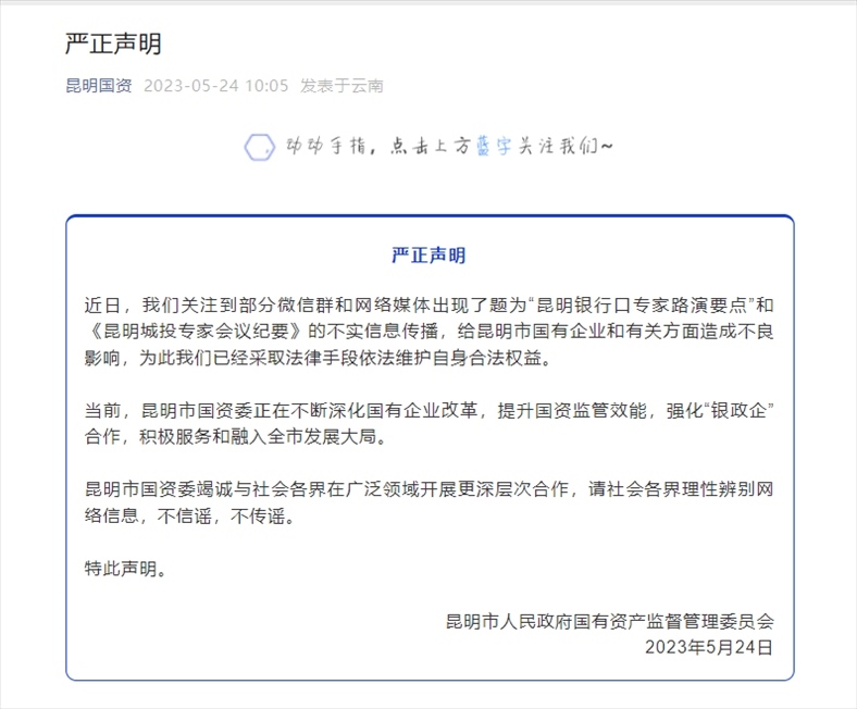 ·昆明市國資委發(fā)布聲明,“昆明銀行口專家路演要點(diǎn)”和《昆明城投專家會議紀(jì)要》不實(shí)。