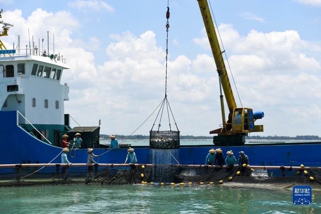 5月27日,在湛江市徐聞縣西連鎮(zhèn),漁業(yè)工人在深海網(wǎng)箱拉網(wǎng)收獲金鯧魚(yú)。   新華社記者 梁旭 攝