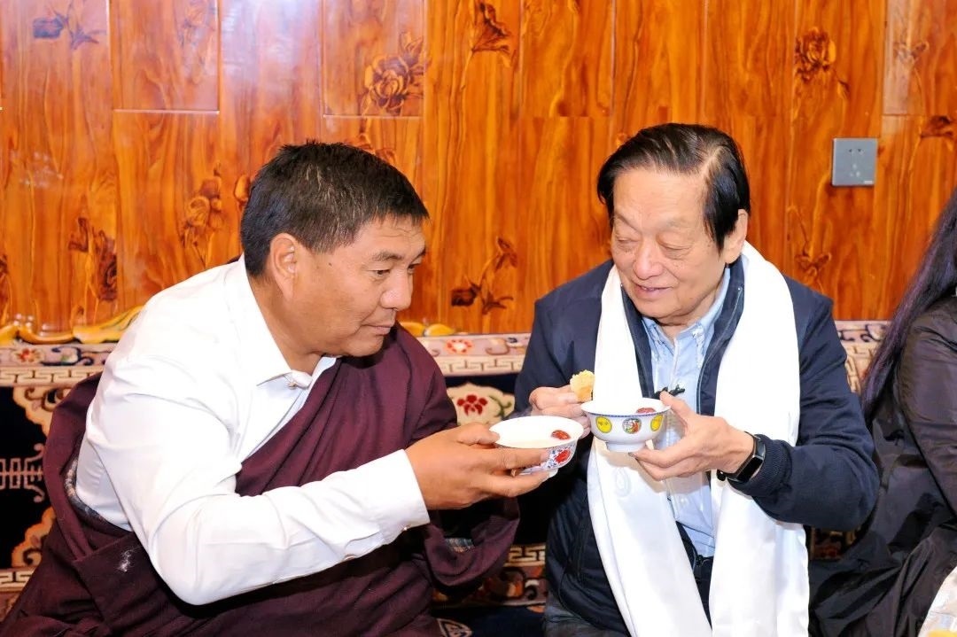 潔白的哈達、香氣撲鼻的奶茶和軟糯的糌粑,無不讓一行人從心底升騰起暖意和感動。韓美林用藏文簽下他們的名字將畫冊送給二人,韓美林說:“我是畫畫的,也許你們對藝術(shù)創(chuàng)作并不熟悉,但我得感謝你們,沒有你們世世代代守衛(wèi)著這片土地上的生命美好,我們的一切創(chuàng)作源泉都無從談起,說到對自然的理解,對生命的尊敬,對傳統(tǒng)的延續(xù),所有人都得向你們學習?!蹦撩穹驄D雖然漢語沒有那么流利,但看著畫冊里精美的作品,愛不釋手,并為韓老師能寫如此準確美麗的藏文而驚訝,直到臨別還不停地用送上哈達的手勢為藝術(shù)大篷車祝福。