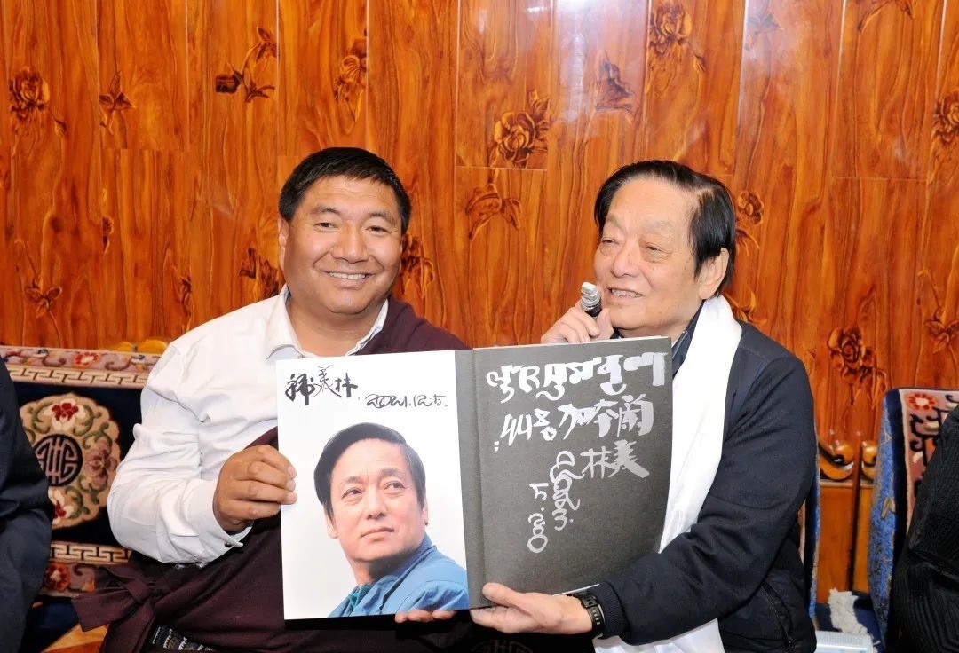 ▲韓美林為原青海省第十二屆人大常委會黨組副書記,現(xiàn)三江源生態(tài)保護基金會理事長鄧本太簽書留念