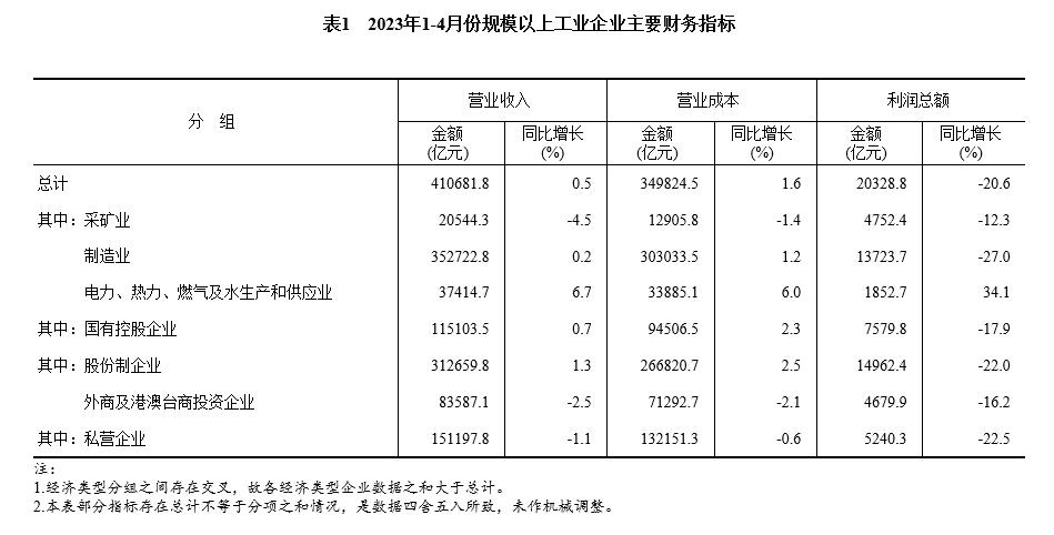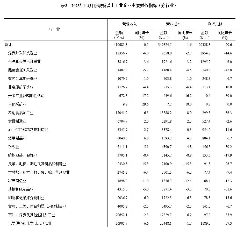 央視網(wǎng)消息:據(jù)國(guó)家統(tǒng)計(jì)局網(wǎng)站消息,1—4月份,全國(guó)規(guī)模以上工業(yè)企業(yè)實(shí)現(xiàn)利潤(rùn)總額20328.8億元,同比下降20.6%(按可比口徑計(jì)算,詳見附注二)。