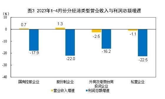 1—4月份,規(guī)模以上工業(yè)企業(yè)中,國(guó)有控股企業(yè)實(shí)現(xiàn)利潤(rùn)總額7579.8億元,同比下降17.9%;股份制企業(yè)實(shí)現(xiàn)利潤(rùn)總額14962.4億元,下降22.0%;外商及港澳臺(tái)商投資企業(yè)實(shí)現(xiàn)利潤(rùn)總額4679.9億元,下降16.2%;私營(yíng)企業(yè)實(shí)現(xiàn)利潤(rùn)總額5240.3億元,下降22.5%。