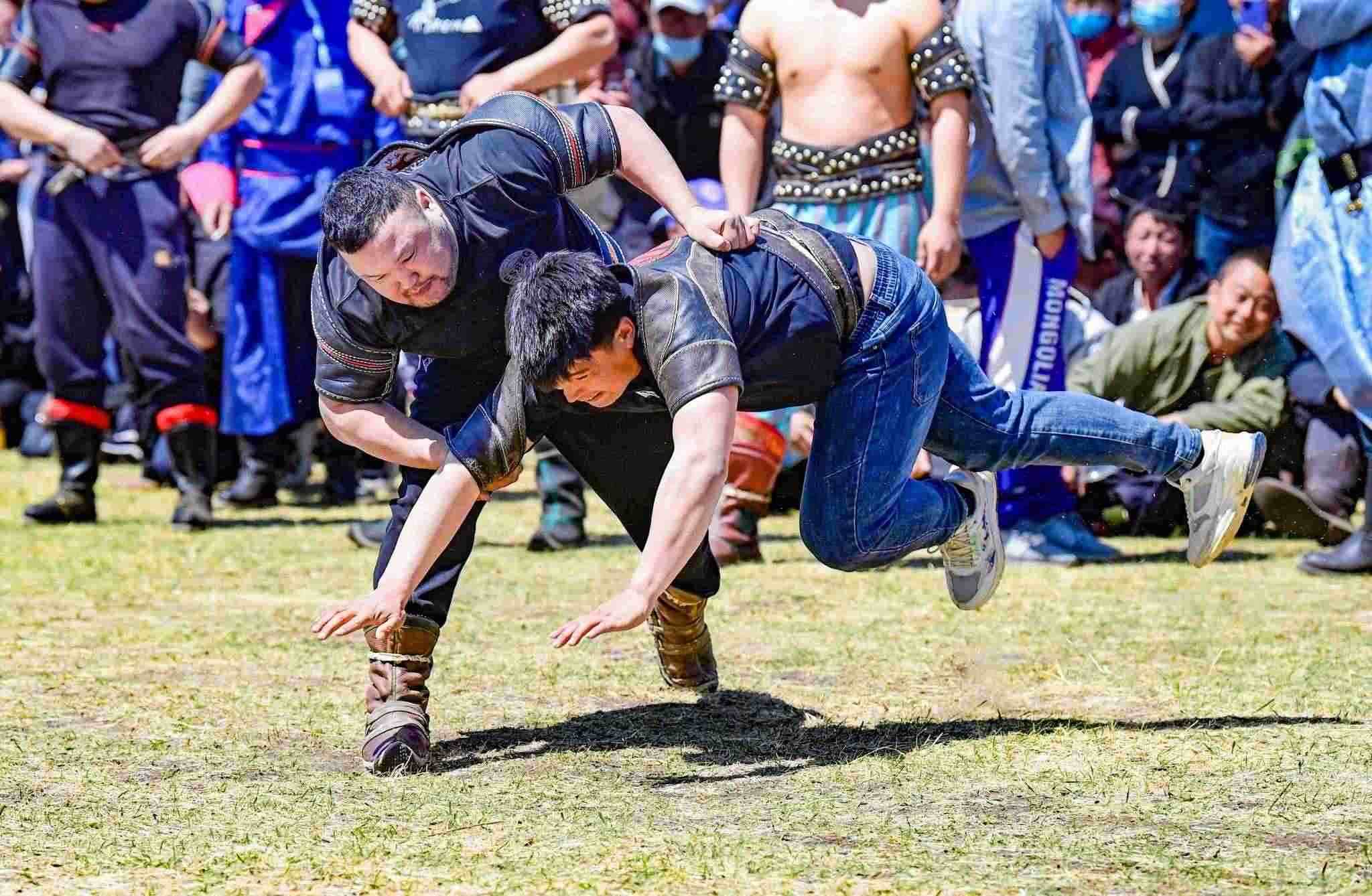 2023年5月26日,內(nèi)蒙古興安盟,科爾沁右翼前旗德伯斯鎮(zhèn)阿日林一合嘎查舉行首屆那達(dá)慕,設(shè)置的賽馬、布魯、搏克、拔河等傳統(tǒng)體育娛樂項(xiàng)目,吸引嘎查周邊500余名牧民參加比賽,喜慶牧業(yè)豐收季。視覺中國