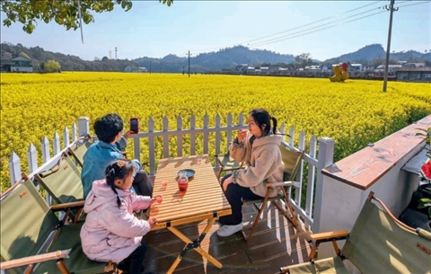 杭州市臨安區(qū)太陽鎮(zhèn)太陽米基地旁的一家民宿餐廳,客人在院子里喝茶賞景(2023年3月28日攝)徐昱攝/本刊