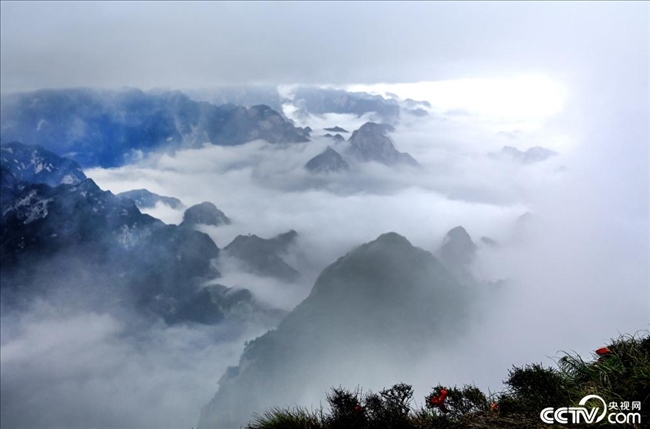 2023年5月26日,陜西渭南,西岳華山云霧繚繞,山峰若隱若現(xiàn)。
