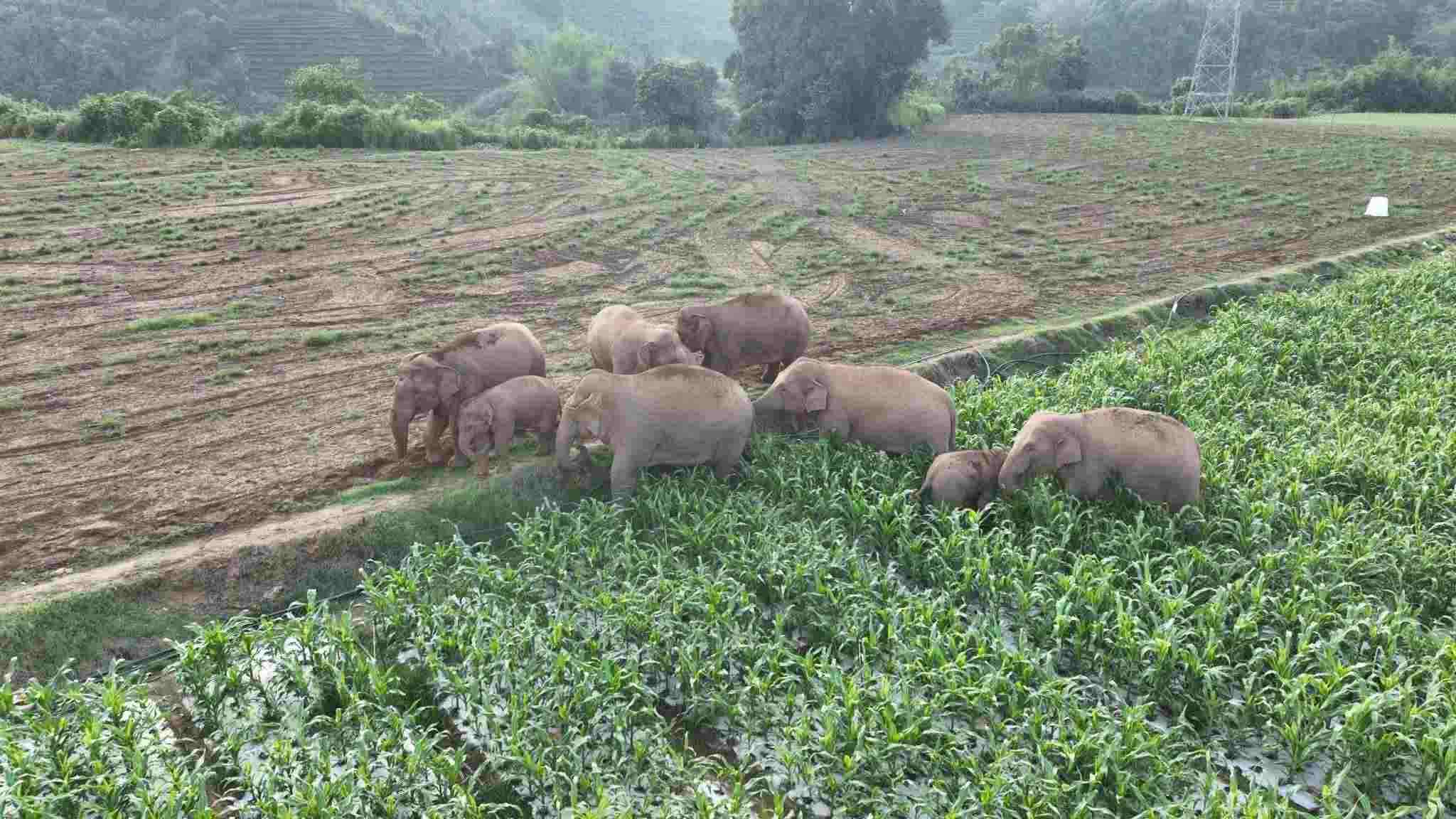 2023年5月17日,云南普洱,亞洲象群出山覓食戲水。視覺中國