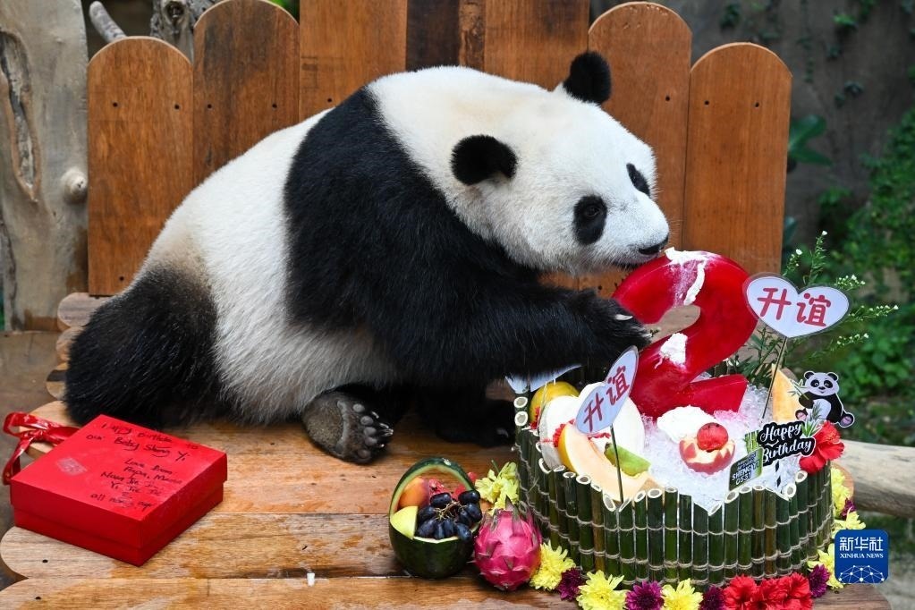 當(dāng)日,大熊貓寶寶“升誼”迎來(lái)兩歲生日,動(dòng)物園為它準(zhǔn)備了特別的生日大餐,眾多民眾前往動(dòng)物園為它慶生?!吧x”是中國(guó)旅馬大熊貓“興興”和“靚靚”生下的第三只寶寶,出生于2021年5月31日中馬建交47周年紀(jì)念日當(dāng)天。新華社記者 朱煒 攝