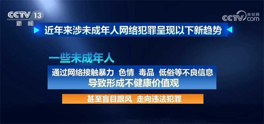 據(jù)最高檢相關(guān)部門負(fù)責(zé)人介紹,近年來涉未成年人網(wǎng)絡(luò)犯罪呈現(xiàn)以下新趨勢(shì):未成年人觸網(wǎng)低齡化日趨明顯,更易遭受網(wǎng)絡(luò)不法侵害;利用網(wǎng)絡(luò)侵害未成年人犯罪手段復(fù)雜多樣,方式不斷翻新,“網(wǎng)絡(luò)誘騙”“隔空猥褻”等新類型犯罪隱蔽性強(qiáng)、打擊難度大;一些未成年人通過網(wǎng)絡(luò)接觸暴力、色情、毒品、低俗等不良信息,導(dǎo)致形成不健康價(jià)值觀,甚至盲目跟風(fēng)、走向違法犯罪;未成年人高額打賞、高額充值、過度消費(fèi)、沉迷網(wǎng)絡(luò),網(wǎng)絡(luò)企業(yè)追求經(jīng)濟(jì)利益、未成年人保護(hù)措施不力等問題較為普遍,反映出網(wǎng)絡(luò)空間監(jiān)管整治形勢(shì)日益復(fù)雜嚴(yán)峻,為未成年人營造良好網(wǎng)絡(luò)環(huán)境難度日漸加大。