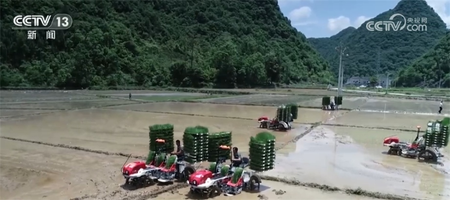 我們再到貴州省黔南州長順縣付家院村去看看。稻田里,多臺插秧機在農(nóng)機手的操作下,將一株株秧苗從苗盤整齊地栽種入田。今年,長順縣計劃種植水稻12萬畝,目前超過6成的水田完成了插秧,預計6月中旬能全部結束。