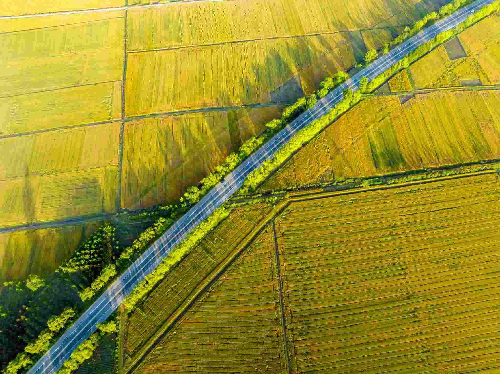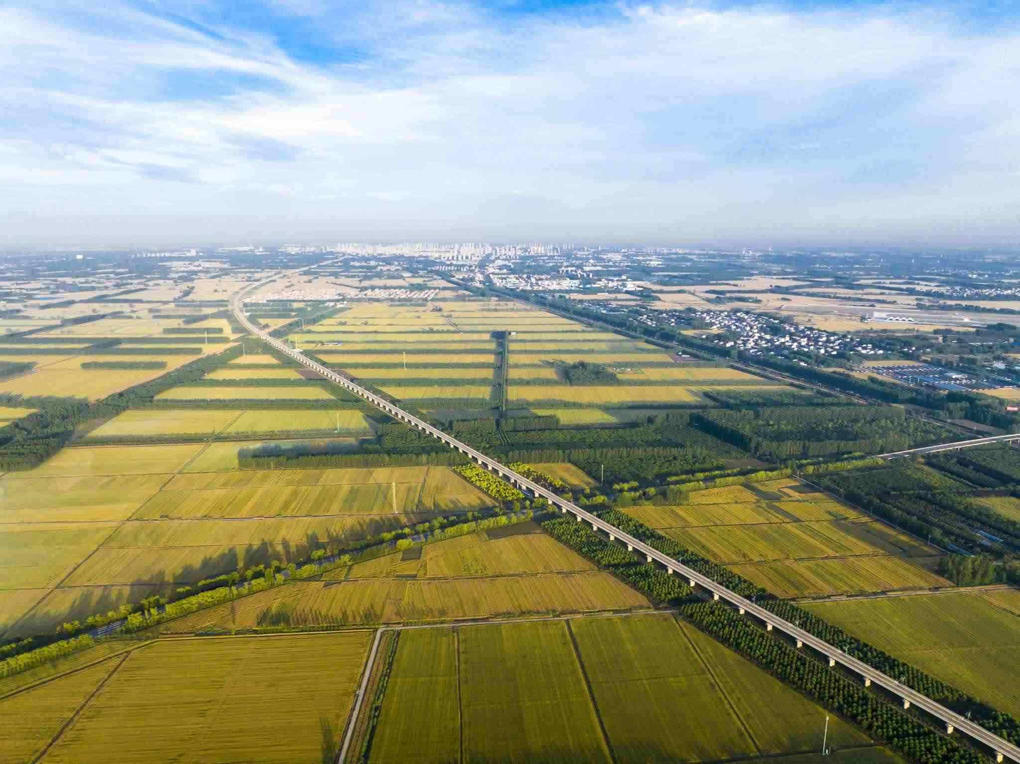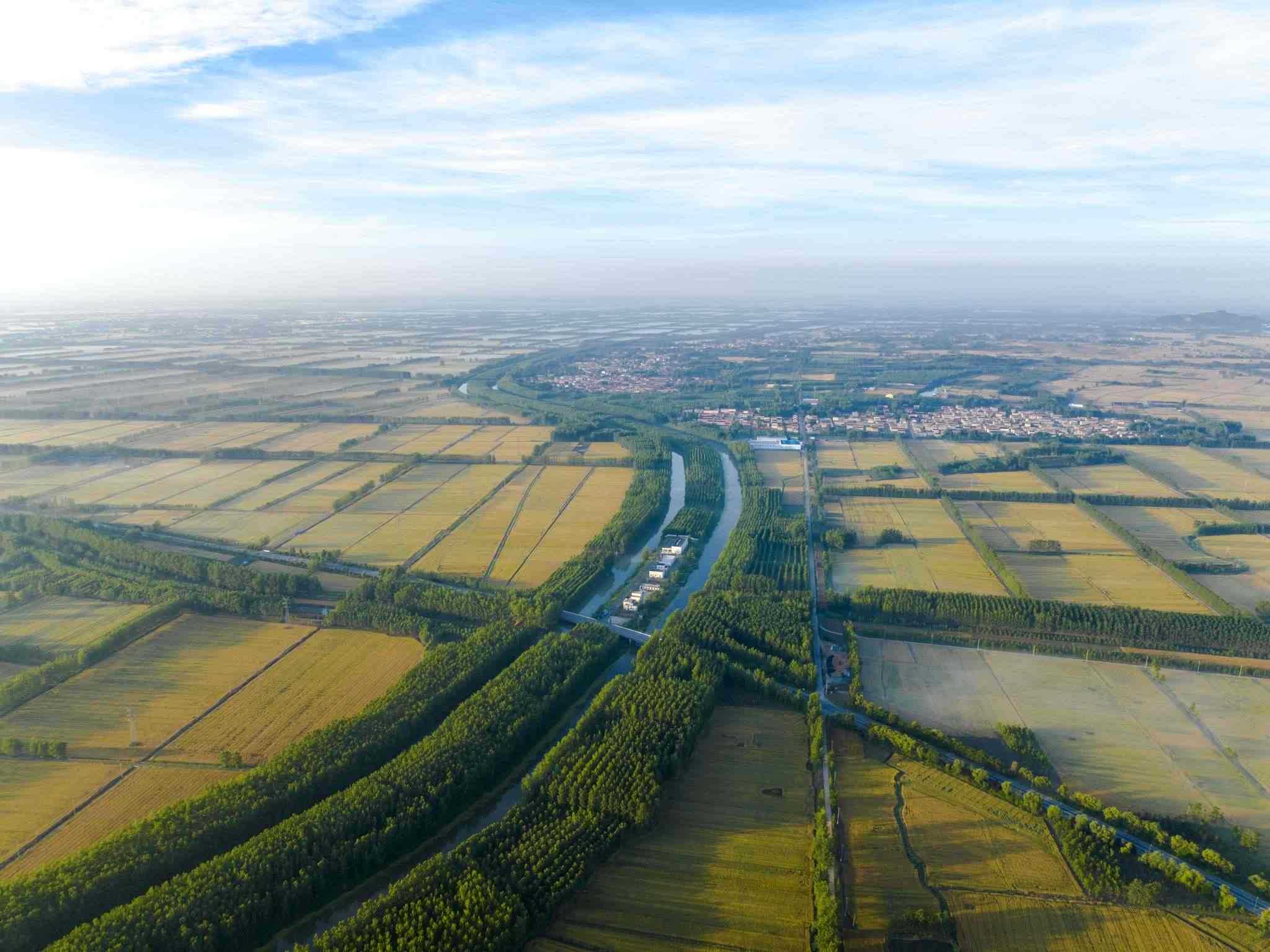 2023年6月3日,江蘇連云港,東??h,金色田野與村莊、道路、河流共同構(gòu)成了一幅秀美的夏日豐收畫卷。視覺中國(guó)