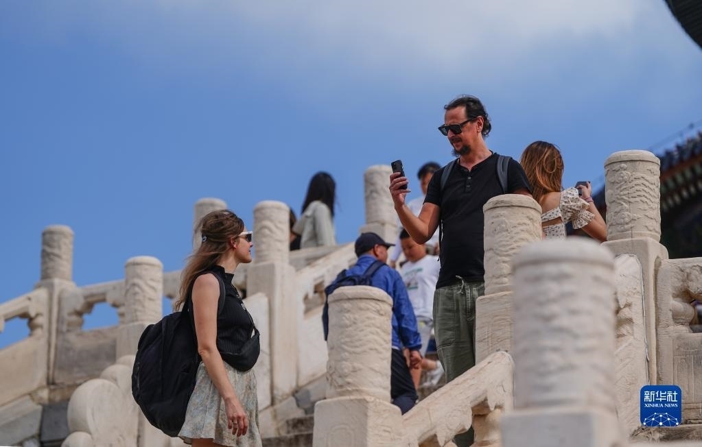 6月9日,游客在藍(lán)天白云下的天壇祈年殿游覽。