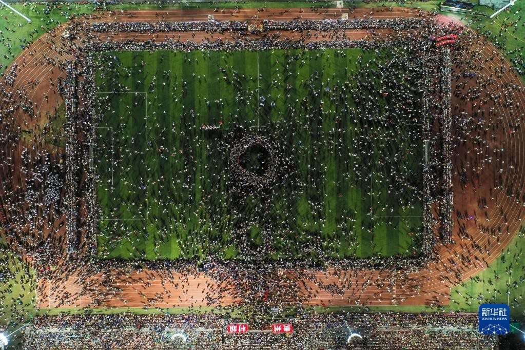 6月10日,演員在貴州“村超”足球比賽后表演民族舞蹈“多耶”,現(xiàn)場(chǎng)觀眾一起上場(chǎng)狂歡(無(wú)人機(jī)照片)。