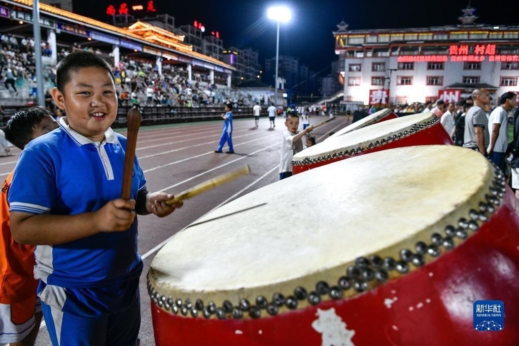 6月9日,一名小朋友在貴州“村超”足球比賽現(xiàn)場(chǎng)擊鼓助威。