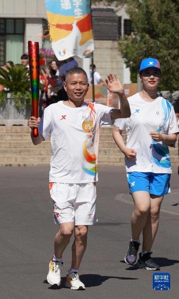 6月10日,火炬手楊凌在火炬?zhèn)鬟f中。